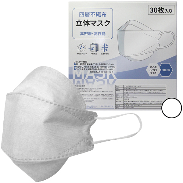 風邪・花粉・ウイルス対策に♪四層不織布立体マスクの30枚入り(ホワイト)です!大人用の普通サイズで高性能四層不織布立体マスク!微小粒子飛沫捕集率(ろ過)効果(PFE)99%。