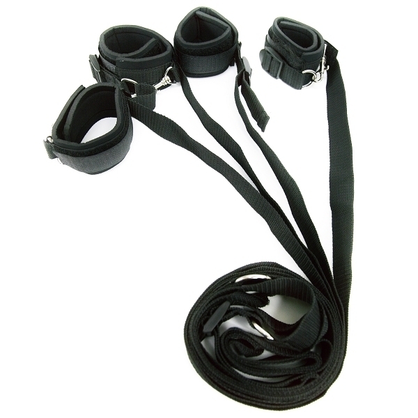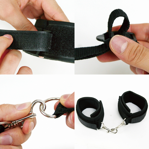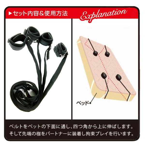 ベルトをベッドの下に通して上下から出し、手枷と足枷をパートナーに装着したら完成!ベッドの脚に繋がなくても良いので、マットレスタイプでも使用可能です。