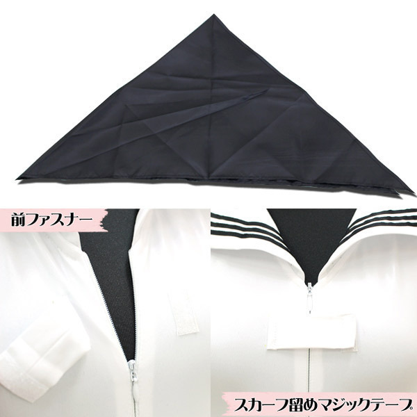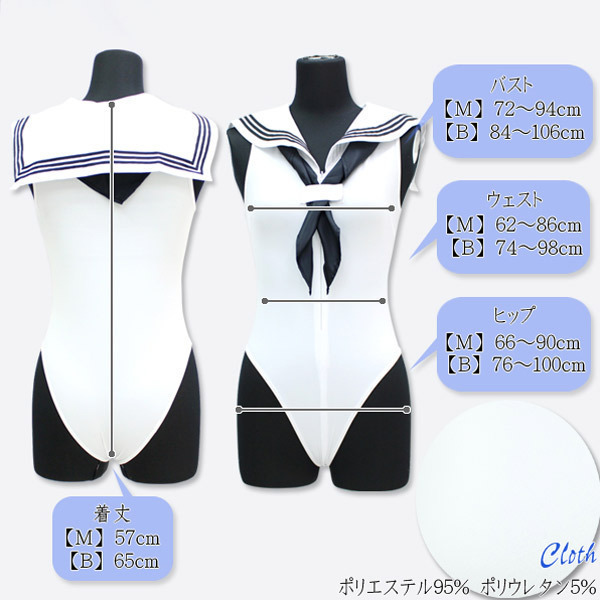 BIGサイズ:B84〜106cm・W74〜98cm・H76〜100cm 着丈65cm セット内容:レオタード(前ファスナー)、スカーフ(マジックテープ) 素材:ポリエステル95%、ポリウレタン5% セーラーノースリーブレオタード 色:白