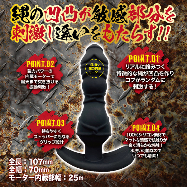 ペニスが緊縛されているような独特の形状の挿入シャフト、そして強弱を含んだ10種類のバイブレーションで穴の中を振動攻めしてくれる「メスイキ クレイジージャンキー (緊縛)」です。